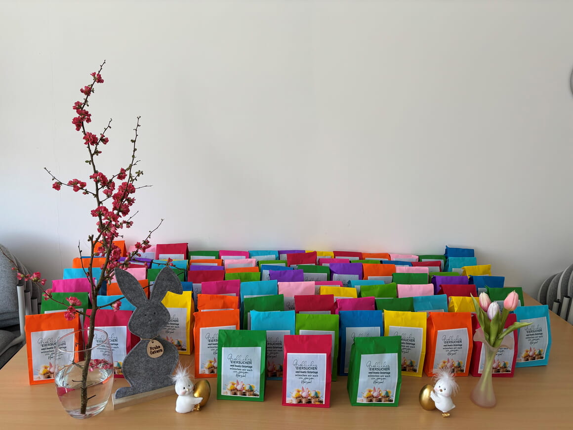 Die bunten Ostertütchen in unserem Besprechungszimmer sind ein Frühlings- und Ostergruß der Diakoniestation – ganz im Zeichen des österlichen Neuanfangs. Alle Mitglieder im Team sind eingeladen, den österlichen Gruß mit nach Hause zu nehmen.